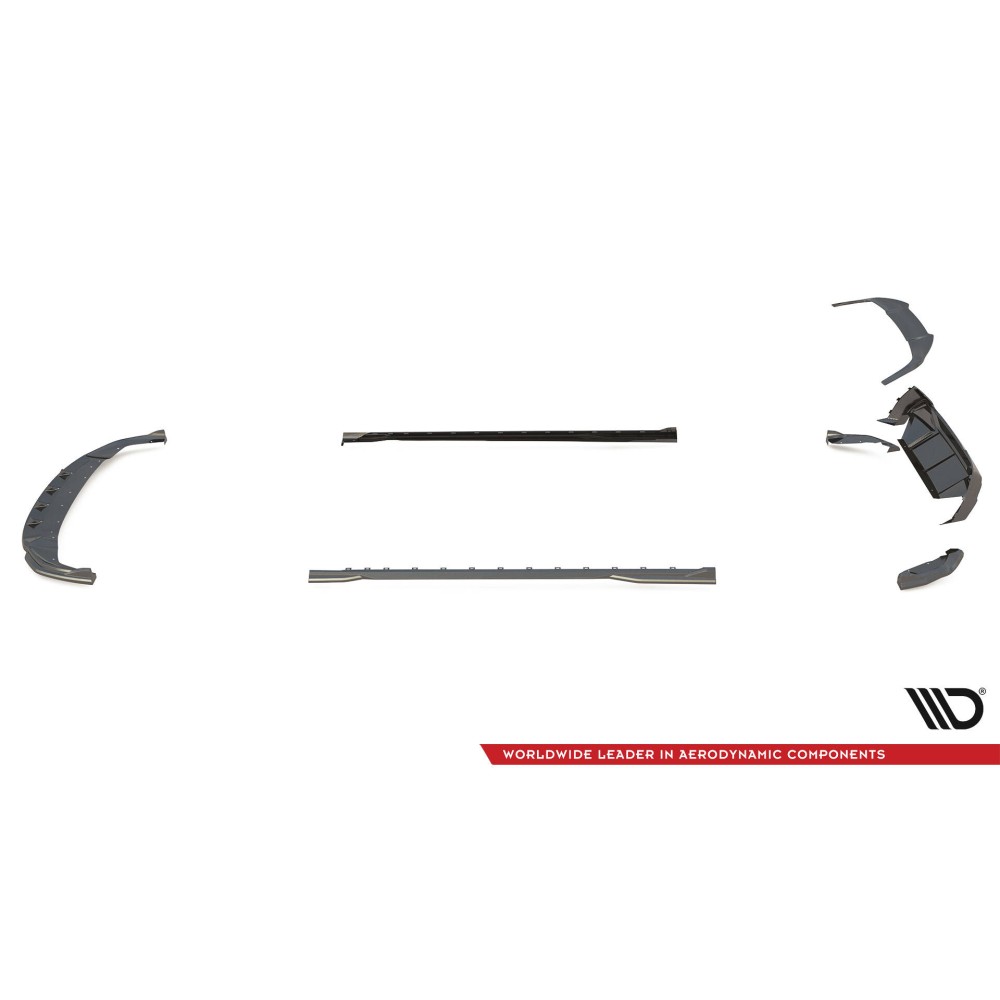 Carbon Set lowers the body. As a result, the airflow space at the front under the car is reduced by 2 centimeters. All elements are equipped with mounting holes. These holes allow you to avoid interfering with the structure of the element and therefore do not reduce its strength.